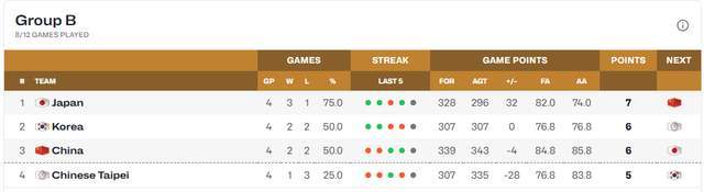 第二窗口期2场比赛打完,目前B组积分榜有了新变化。日本队3胜1负稳居第一,韩国队2胜2负积6分,中国男篮同样2胜2负,却因交锋战绩0-2落后韩国,只能排在第3。