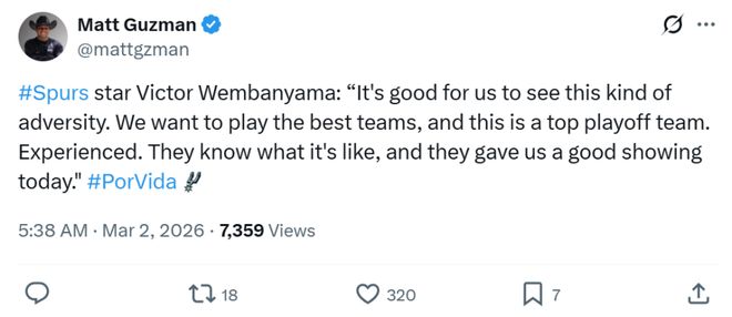 除此之外,马刺队本场三分线外也失准,34次出手仅命中9球,其中文班更是三分7投仅1中。